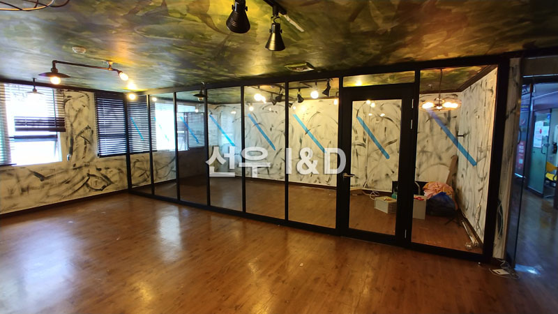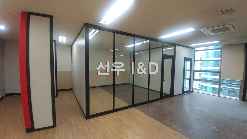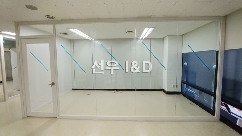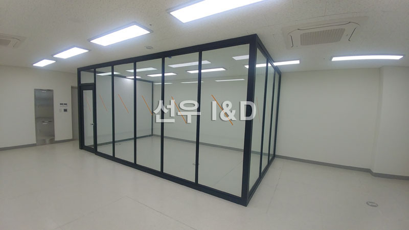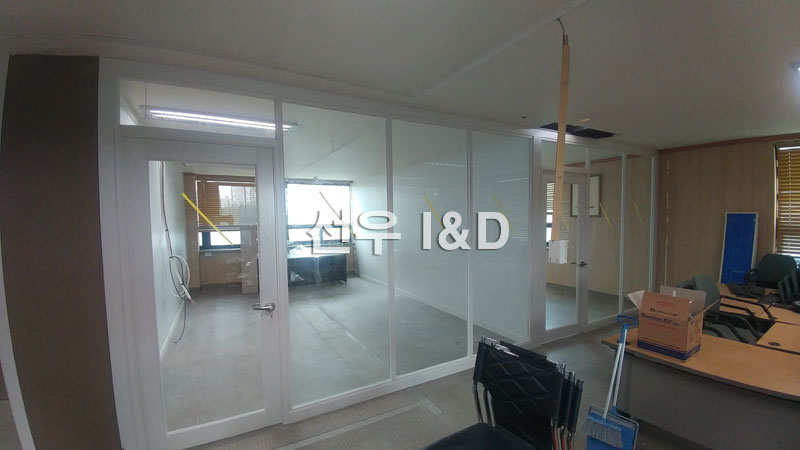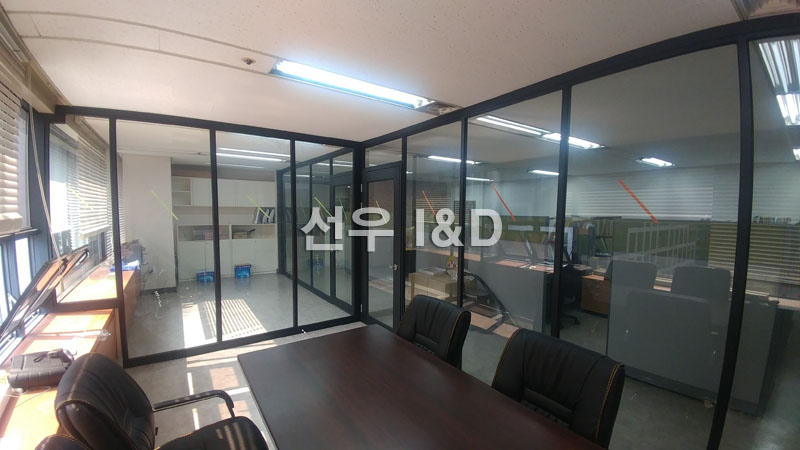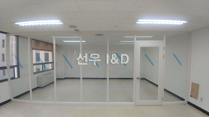 목재,철재등을 이용하여 상부와 하부에 후레임을 설치하고 유리를 시공하는 방식으로 주로 회의실에 많이 사용됩니다.